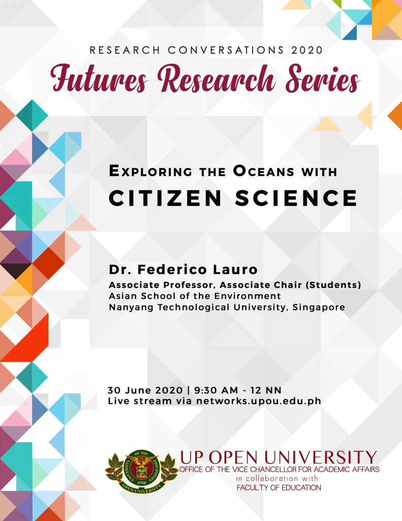 The UPOU Office of the Vice Chancellor for Academic Affairs (OVCAA), in collaboration with the Faculty of Education (FED), is inviting you to the fourth installment of the Futures Research Series with Dr. Federico Lauro as the resource speaker. Dr. Lauro shall talk about “Exploring the Oceans with Citizen Science”. This will be on 30 June 2020 (Tuesday), 9:00 AM to 12:00 NN.