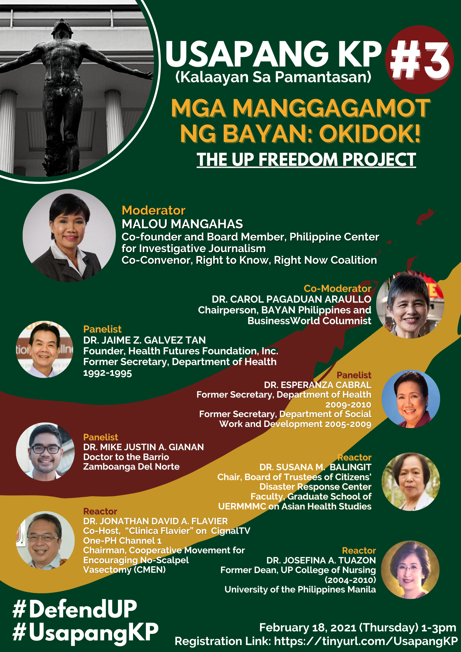 Moderator: Malou Mangahas Co-Founder and Board Member, Philippine Center for Investigative Journalism Co-Convenor, Right to Know, Right Now Coalition Co-Moderator: Dr. Carol Pagaduan Araullo Chairperson, BAYAN Philippines Columnist, BusinessWorld Panelists: Dr. Jaime Z. Galvez Tan Founder, Health Futures Foundation, Inc. Former Secretary, Department of Health 1992-1995 Dr. Esperanza Cabral Former Secretary, Department of Health 2009-2010 Former Secretary, Department of Social Work and Development 2005-2009 Dr. Mike Justin A. Gianan Doctor to the Barrio Zamboanga Del Norte Reactors: Dr. Susana M. Balingit Chair, Board of Trustees of Citizen’s Disaster Response Center Faculty, Graduate School of UERMMMC on Asian Health Studies Dr. Jonathan David A. Flavier Co-Host, “Clinica Flavier” on CignalTV One-PH channel 1 Chairman, Cooperative Movement for Encouraging No Scalpel Vasectomy (CMEN) Dr. Josefina A. Tuazon Former Dean, UP College of Nursing 2004-2010 University of the Philippines Manila |