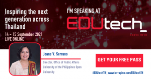 Dr. Joane Serrano, Director of Office of Public Affairs, UP Open University (UPOU) will serve as a moderator at the EDUtech Thailand on 14 & 15 September 2021. Catch her moderating the live panel “Campus of the future: What does it look like?”
