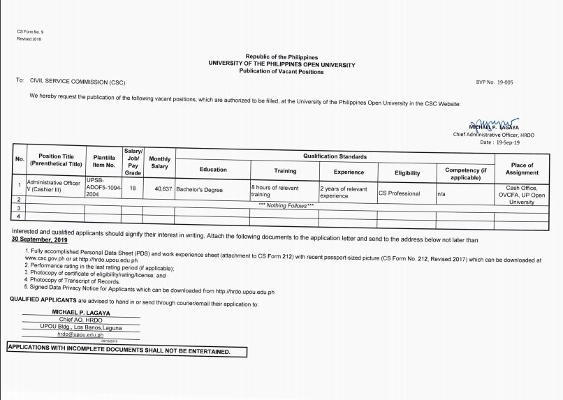50 Administrative Officer V (Cashier III) Cash Office, Office of the Vice Chancellor for Finance and Administrator September 30,2019 View