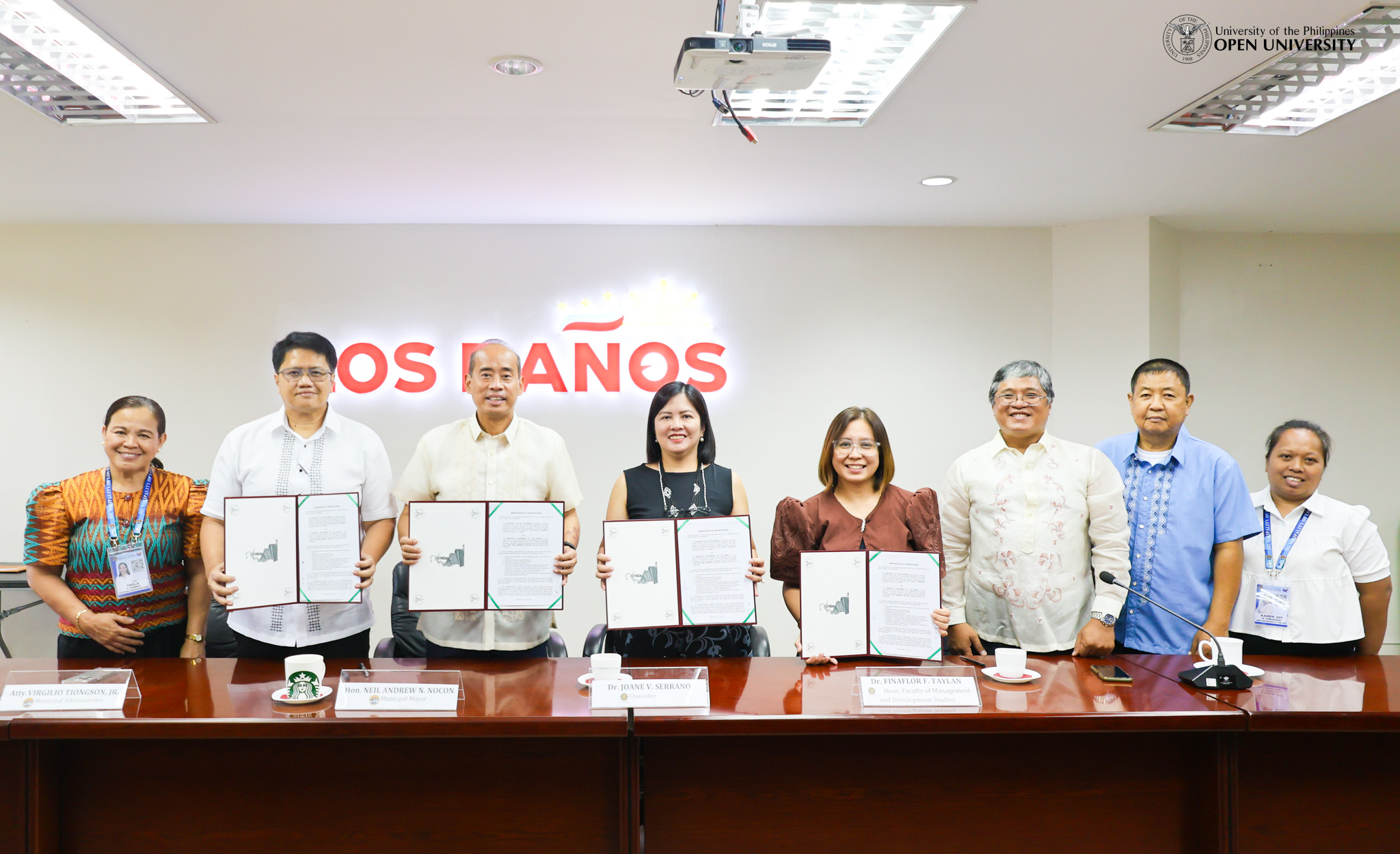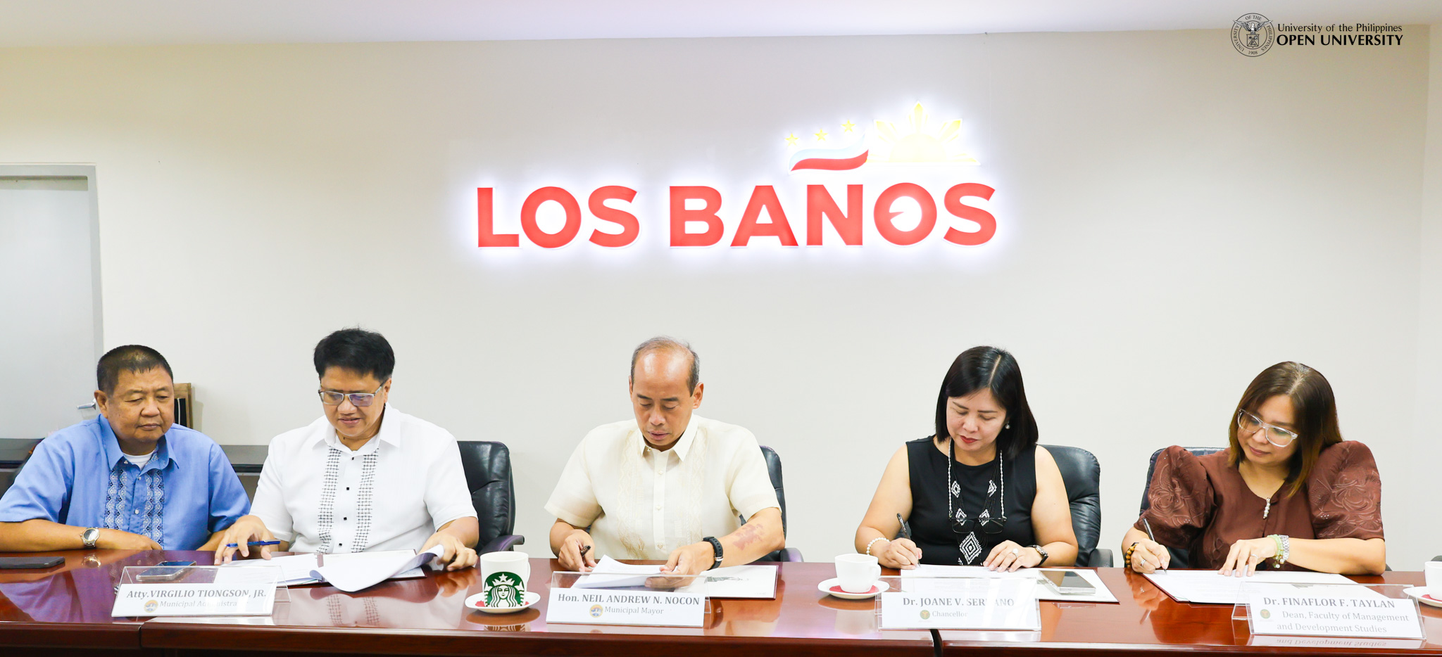 The signing was also graced by Dean Finaflor F. Taylan and Asst. Prof. Ari Luis Halos of the Faculty of Management and Development Studies (FMDS), UP Open University, Brgy. Chairman Ian Kalaw of Barangay Batong Malake, and Atty. Virgilio Tiongson, Jr., Municipal Administrator of Los Baños.