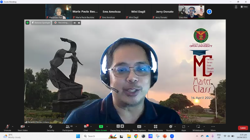 The University of the Philippines Open University (UPOU) Faculty of Information and Communication Studies (FICS) held a Masterclass entitled, “KM4D Revisited: Backstories on the Los Baños Brand of Knowledge Management,” on 14 April 2023 with Dr. Alexander Flor as Thought Leader. Assistant Professor Winifredo Dagli from the University of the Philippines Los Baños (UPLB) College of Development Communication (CDC) and Mr. Benedict Juliano from the London Stock Exchange Group’s KM Content Strategy and Editorial also provided additional insights as Reactants. It was held via Zoom and live-streamed through UPOU Networks, Facebook, and Youtube.