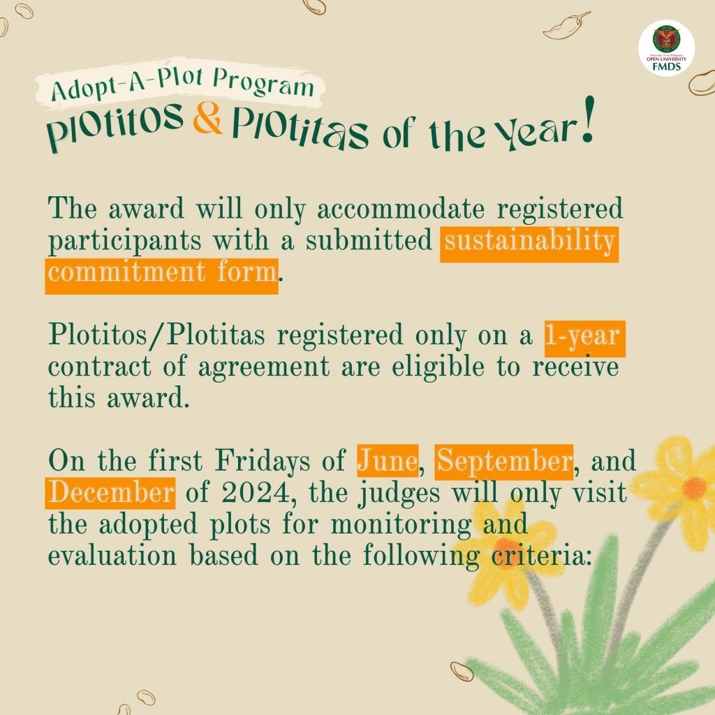 Please be reminded that judges will only visit the adopted plots for monitoring and evaluation on the first Fridays of June, September, and December 2024.