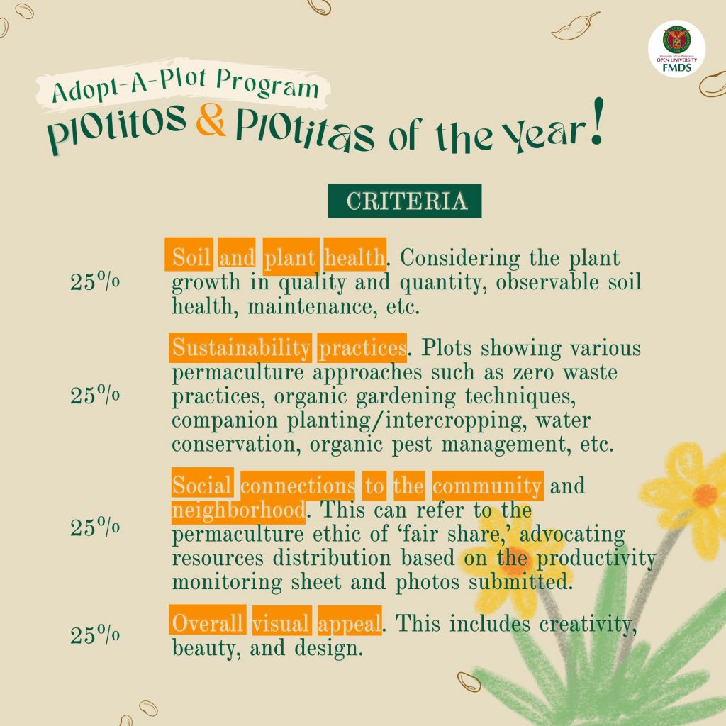 This competition seeks to promote engagement among UPOU employees, students, alumni, and partners in fostering a sense of community and shared responsibility for environmental stewardship, and promote biodiversity by allowing them to adopt individual or group plots. Join us in building a sustainable and resilient UPOU by adopting a plot in the FMDS Perma G.A.R.D.E.N. (Growing Appreciation Toward Resilience, Development, Entrepreneurship, and Nutrition) and stand a chance to win exciting prizes! 🏆🌱🏅